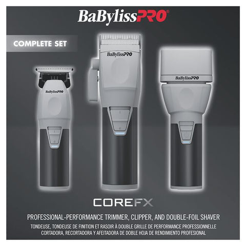 BaBylissPRO COREFX Prepack, featuring a high-performance clipper, trimmer, and shaver designed for precision, power, and durability. This limited edition COREFX set delivers professional results with ergonomic designs, high-speed motors, and advanced blades for the perfect cut, trim, and shave.